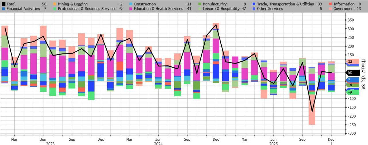 Ahead of today's jobs report, expectations were that the NFP number would show another rebound from the terrible Sept/Oct prints, but remain muted (or else spark fears about reheating and an end to the Fed's easing cycle). Well, that's precisely what we got moments ago when the BLS reported that in December the US gained 50K jobs, a modest miss to estimates of 50K, but smack in the middle of JPM's sweet spot range of 35K-75K (as previewed earlier) which would be best for the market.