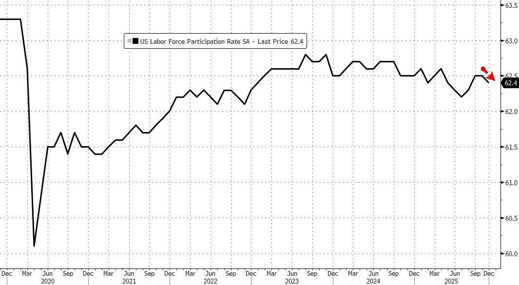 Labor force participation dipped fractionally from 62.5% to 62.4%, in line with estimates. The employment-population ratio, at 59.7%, was also unchanged in December. These measures have shown little change over the year.