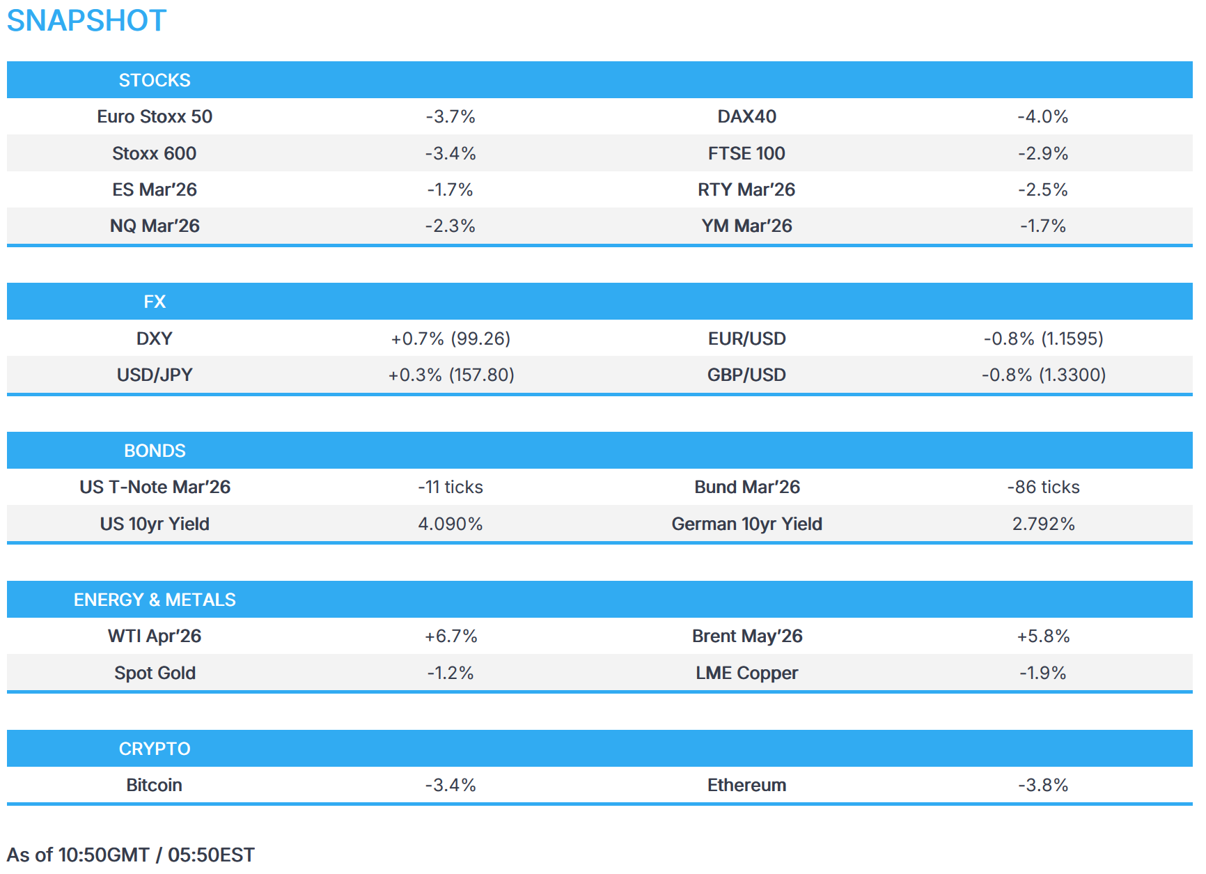 - Nat Gas has been in focus amid the upside from the war, further exacerbated by Qatar's shuttering of output yesterday. Qatar accounts for roughly one-fifth of global LNG supply. Analysts warn that every week of downtime removes 1.6-1.8mln tons of LNG from the global market. Dutch TTF currently trades +23% intraday at EUR 54.805/MWh vs around EUR 32/MWh on February 27th.