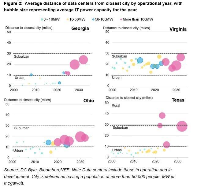 BNEF’s data center project tracker shows the industry diversifying beyond traditional data center hubs like Northern Virginia, metro Atlanta and central Ohio into exurban and rural regions served by existing fiber-optic trunk lines for data traffic.