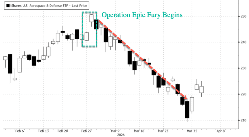 Let's start with iShares U.S. Aerospace & Defense ETF, or ITA, a basket of major U.S. defense firms. ITA caught an early bid in the first phase of Operation Epic Fury, but the rally failed to hold shortly after that. By late March, the fund was down nearly 16%. The fund has since rebounded in recent sessions, trading around $223 on Thursday morning, but the defense complex's inability to sustain a war-driven rally caught investors off guard.