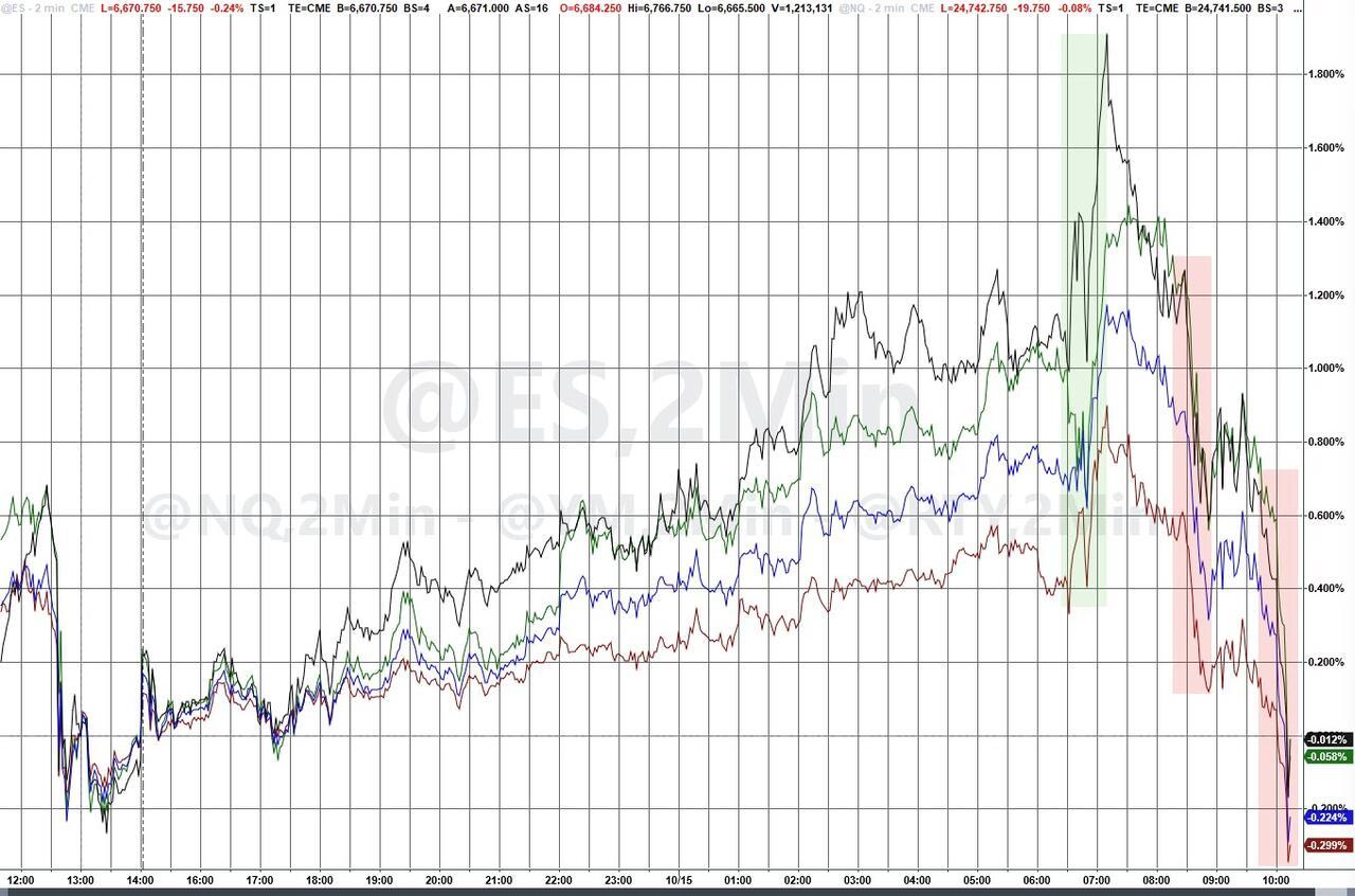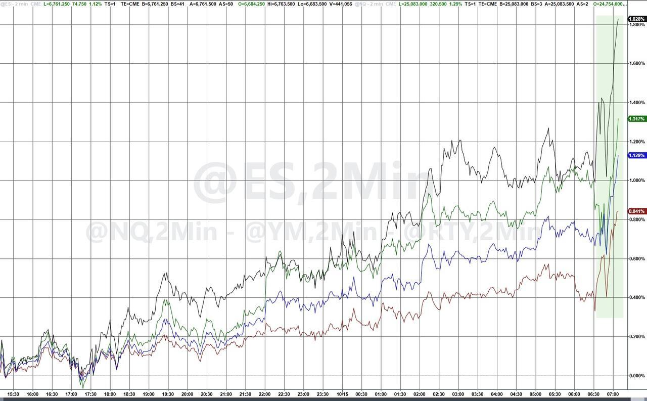 Update (1300ET): As we noted earlier, stocks jumped around the US cash open on optimistic headlines about possible tariff delays by Bessent and Greer: "*GREER: EXPECT CHINA RARE EARTHS MOVE DOESN'T GO INTO EFFECT,*BESSENT SUGGESTS POSSIBILITY OF LONGER CHINA TARIFF TRUCE".