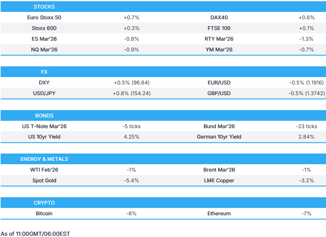- DXY bid, USTs lower with the yield curve steeper and US equity futures down (ES -0.8%) amid the Warsh speculation.