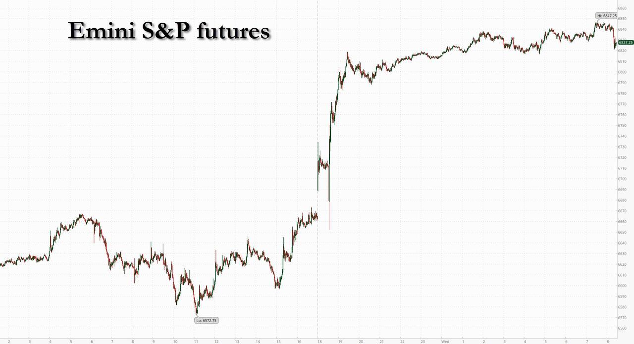 US futures, global stocks and bonds are sharply higher while oil prices plunge the most in years as a wave of optimism swept through global markets after the US and Iran agreed to a two-week ceasefire in exchange for Tehran reopening the Strait of Hormuz: JPMorgan's Market Intel desk, which moves from Neutral to Tactically Bullish this morning, says to look for a re-risking in the very near-term albeit it with higher energy prices. As of 8:00am ET, S&P futures are 2.8% higher while emerging-market stocks rallied the most since 2022; Nasdaq gains 3.5% with Mag7 and Semis seeing significant bids as part of an ‘Everything Rally’ ex-Energy. Yet while the overwhelming mood in markets is relief, the same core challenges remain to find a resolution amenable to both countries and Goldman's Delta-One head says he is selling the rally. Brent plunged 16% to around $93 a barrel. Bonds surged, with 10Y tsy yields sliding 8bps to 4.23% while benchmark UK yields tumbled by 22 basis points. The dollar weakened to a one-month low. Gold and silver gain. The macro data focus today is on the Fed Minutes ahead of PCE and CPI releases later this week.