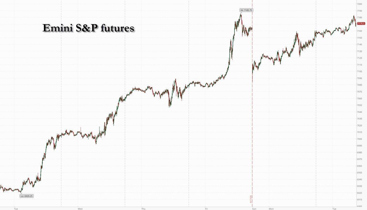 The optimism that helped list the S&P on 11 of the prior 12 days, and the Nasdaq on 13 consecutive days until Monday's modest pullback, is back - because one can apparently draw the same exact event for 3 weeks now - and sending US equity futures higher again on signs that Iran will attend talks with the US, while the US president said it’s “highly unlikely” that he’d extend the truce. As of 8:00am, S&P 500 futures rose 0.4%, rebounding from Monday’s decline, and supposed by solid earnings, the AI narrative and positioning even as the situation in the Middle East remains unresolved. Nasdaq 100 futures rose 0.5% with most Mag 7 names higher: AMZN +2.8%, META +0.6%, AAPL -0.4%. Apple announced its new CEO after yesterday’s close (hardware chief John Ternus will become the CEO effective September 1st); AMZN announced it will invest another $25bn in Anthropic with Anthropic committing to spending more than $100bn over the next 10yr on AWS. 10Y yields added 1bps to 4.26%. Commodities are mostly lower: Copper -0.5%, Silver -1.0%, WTI crude was flat at $87.60 per barrel, reversing a modest loss. Retail sales and Warsh’s confirmation hearing will be in focus later.