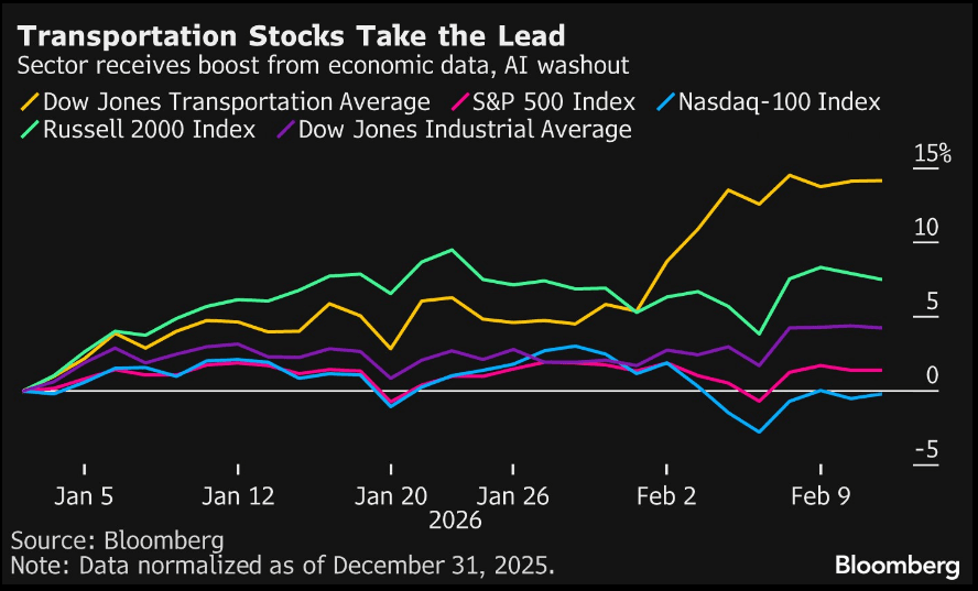 The AI winners and losers trade is playing out across the world, helping Asian markets — with a heavy concentration of AI hardware firms — extend their lead over the US. That’s left the S&P 500 ranking 69th among the 92 stock indexes tracked by Bloomberg, according to Markets Live. Among sectors, jitters over software have given the ‘old economy’ stocks in the Dow Jones Transportation Average a new lease of life.
