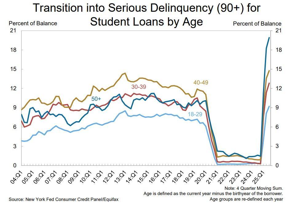 And the most remarkable observation: over 20% of all student debt by those aged 50 and over (!) is effectively in default (technically it is still delinquent, but if millions haven't made even a token effort to repay it in 90 days, one can safely classify it as in default).