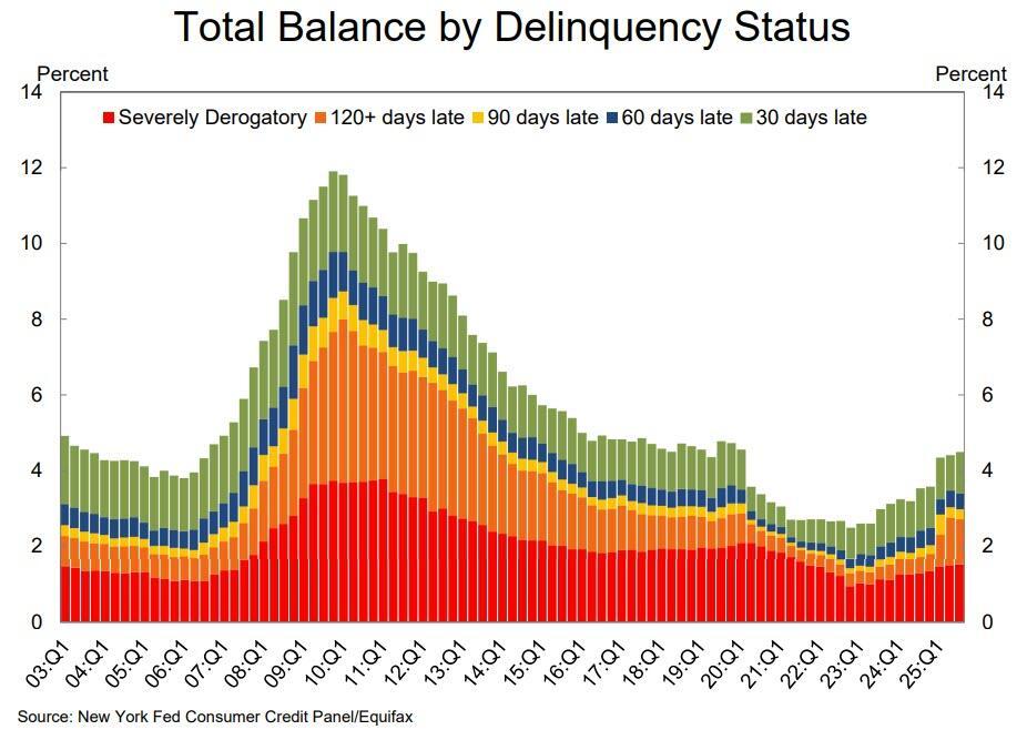As the NY Fed writes, aggregate delinquency rates remained elevated in Q3 2025, with 4.5% of outstanding debt in some stage of delinquency. Transitions into early delinquency were mixed with credit card debt and student loans increasing, while all other debt types saw decreases.