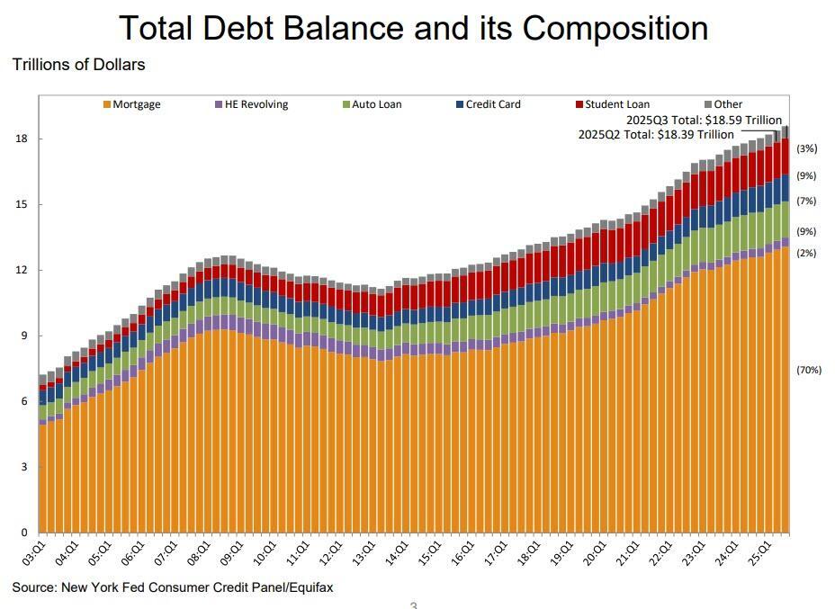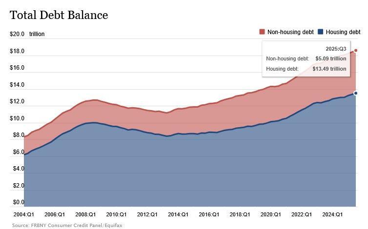 Surprising exactly no-one, the report showed that total household debt increased by $197 billion (1%) in Q3 2025, to a new record high of $18.59 trillion. split between $13.5 trillion in housing debt and $5.1 trillion in non-housing debt.