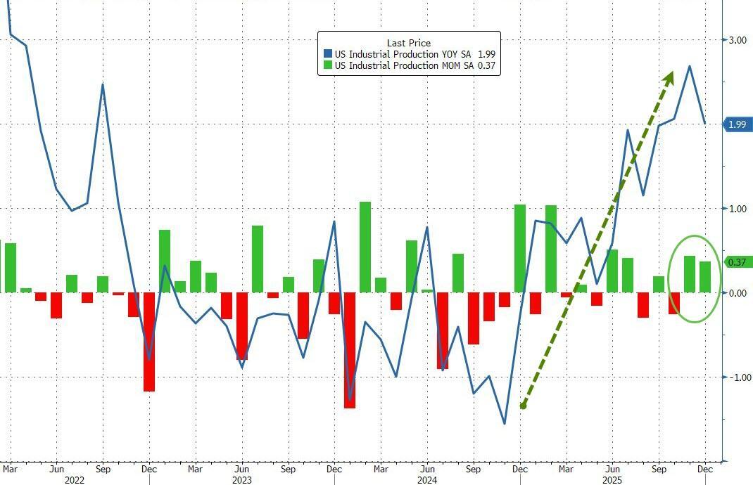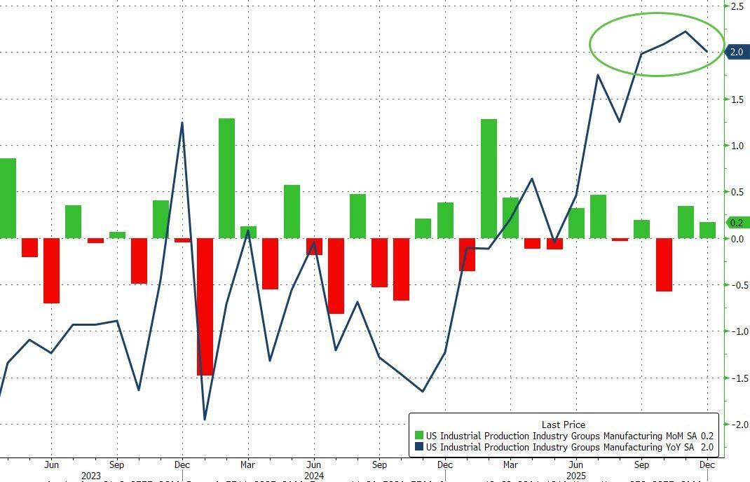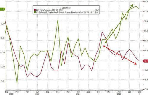 While 'soft' survey data has been disappointing, hard macro data has been resilient and Industrial Production ended 2025 on a bright note with a 0.4% MoM surge in December (considerably better than the +0.1% MoM expected) complementing November's 0.4% MoM rise. This left industrial production up 2% YoY...