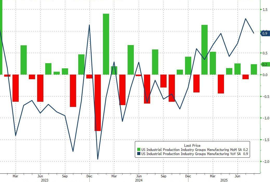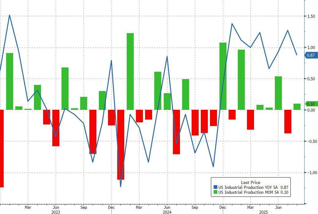 US Industrial production rose 0.1% MoM in August (better than the small 0.1% MoM decline expected) and a modest rebound from July's weakness. YoY growth in production dipped to 0.9%...