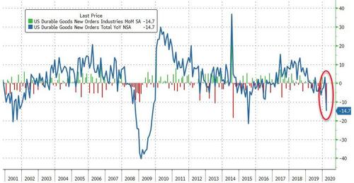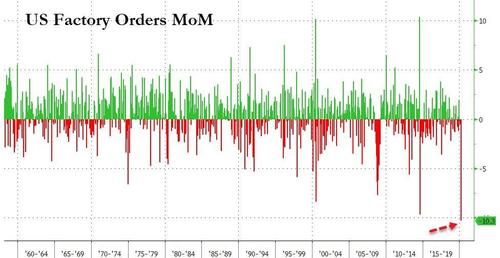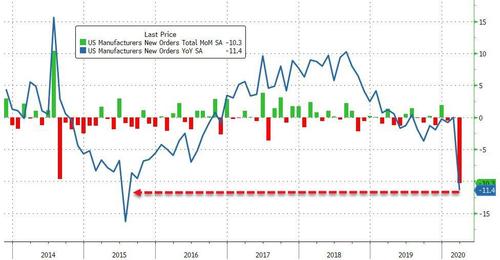 Amid collapsing employment, crashing sentiment signals, and carnage in any hard data signals around the world, it is no surprise that analysts expected a 9.7% MoM plunge in factory orders in March (still before the major lockdowns in April).