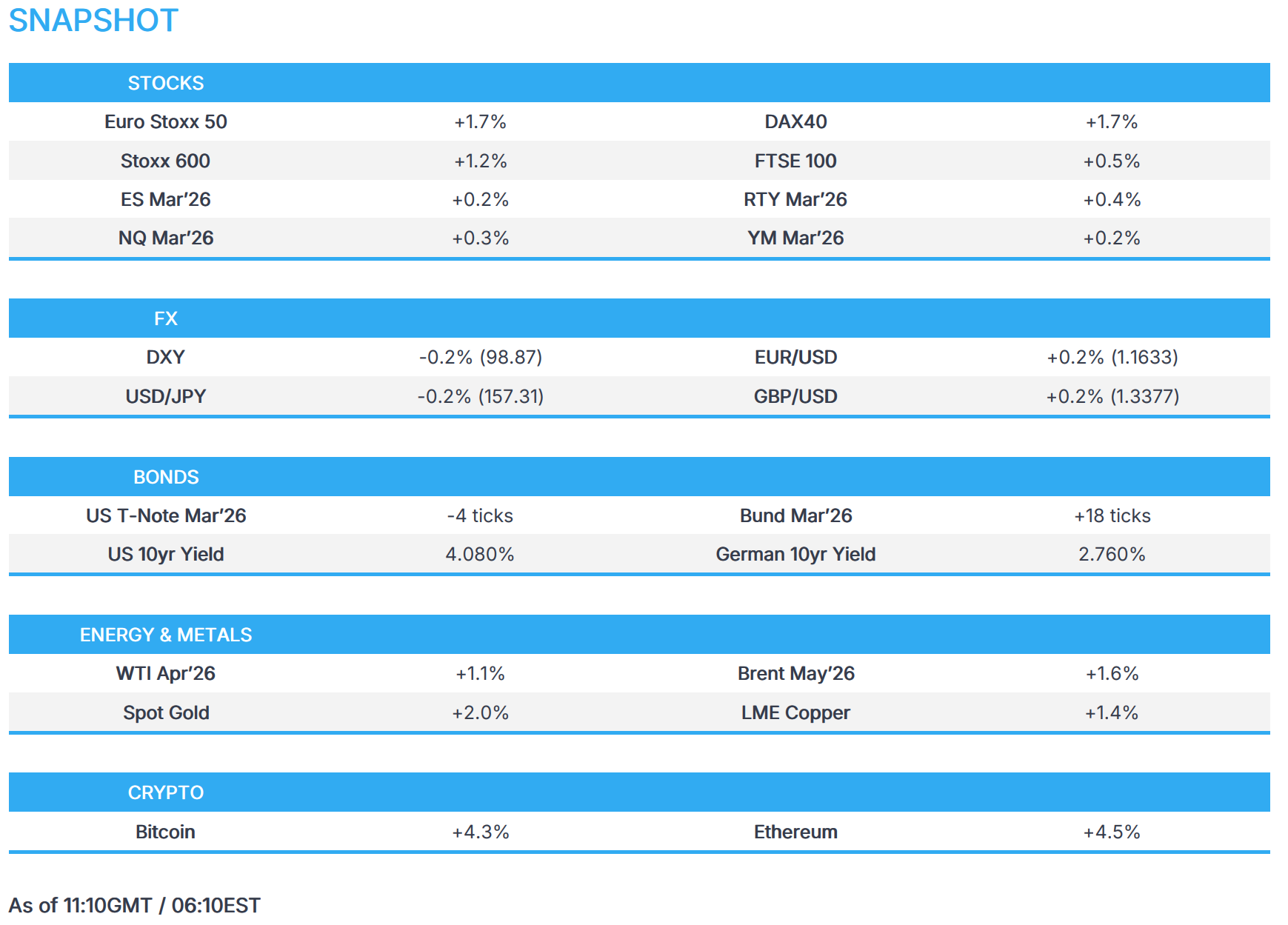 - Upside was seen across equity futures following reports that Operatives from Iran’s Ministry of Intelligence reached out indirectly to the CIA a day after the conflict began, with an offer to discuss terms for ending the conflict, New York Times reports citing sources. US officials are reportedly sceptical that either the Trump administration or Iran is ready for an off-ramp in the short term at least.