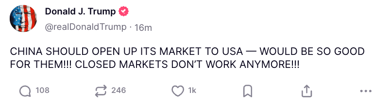 "CHINA SHOULD OPEN UP ITS MARKET TO USA — WOULD BE SO GOOD FOR THEM!!! CLOSED MARKETS DON'T WORK ANYMORE!!!"