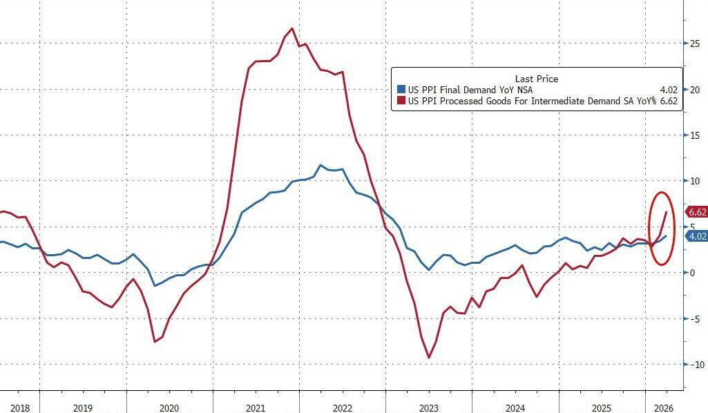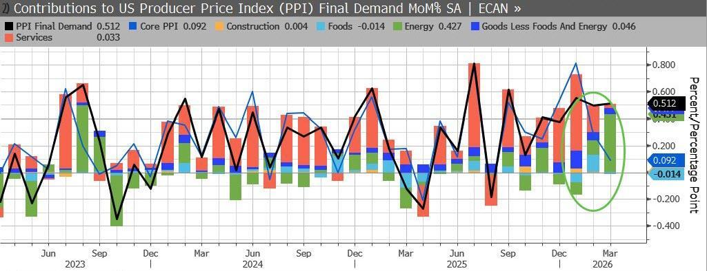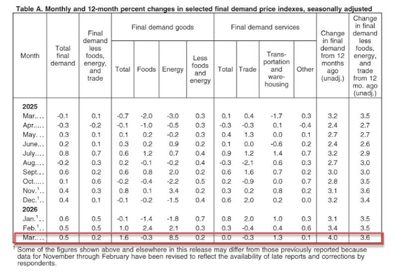 The month-over-month change in producer prices had accelerated for five straight months ahead of today's March data, which is expected to surge thanks to Iran-war impacts on energy costs.