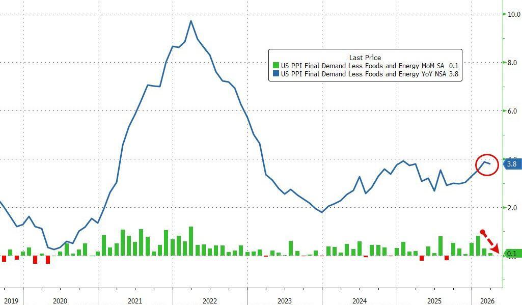 However, in a similar manner to CPI, we see Core Producer prices (ex-food-and-energy) rising just 0.1% MoM (dramatically cooler than +0.4% MoM exp). This pulled the Core PPI YoY down from +3.9% to +3.8%...
