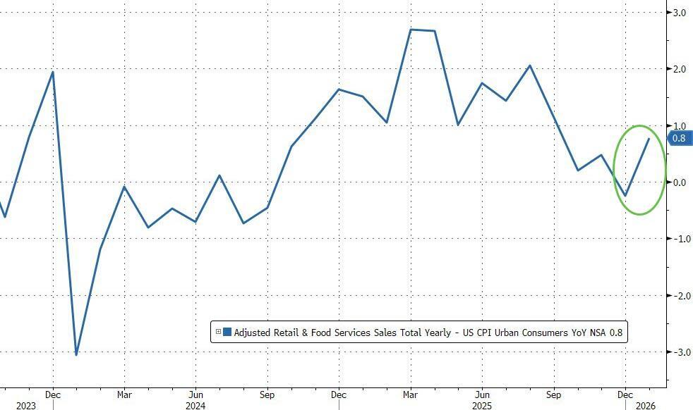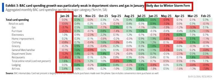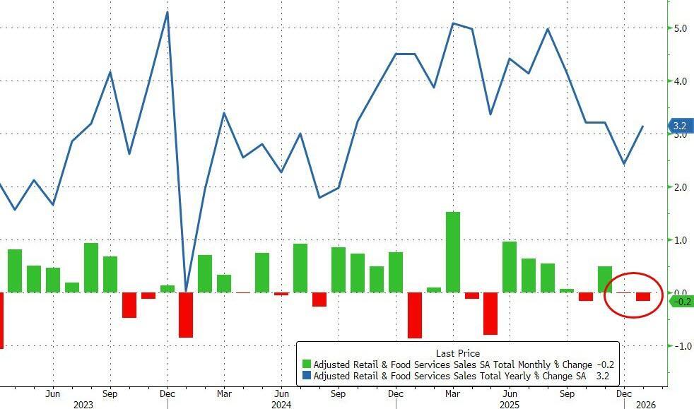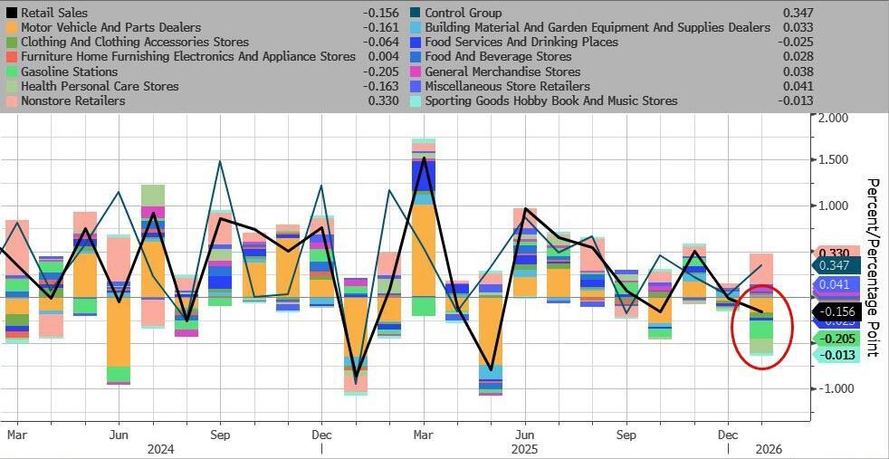 This morning's retail sales data is for January (still lagging due to the govt shutdown) and is expected to be a decline (BofA's omniscient analysts see a worse than consensus drop MoM, due in large part to weather disruptions).