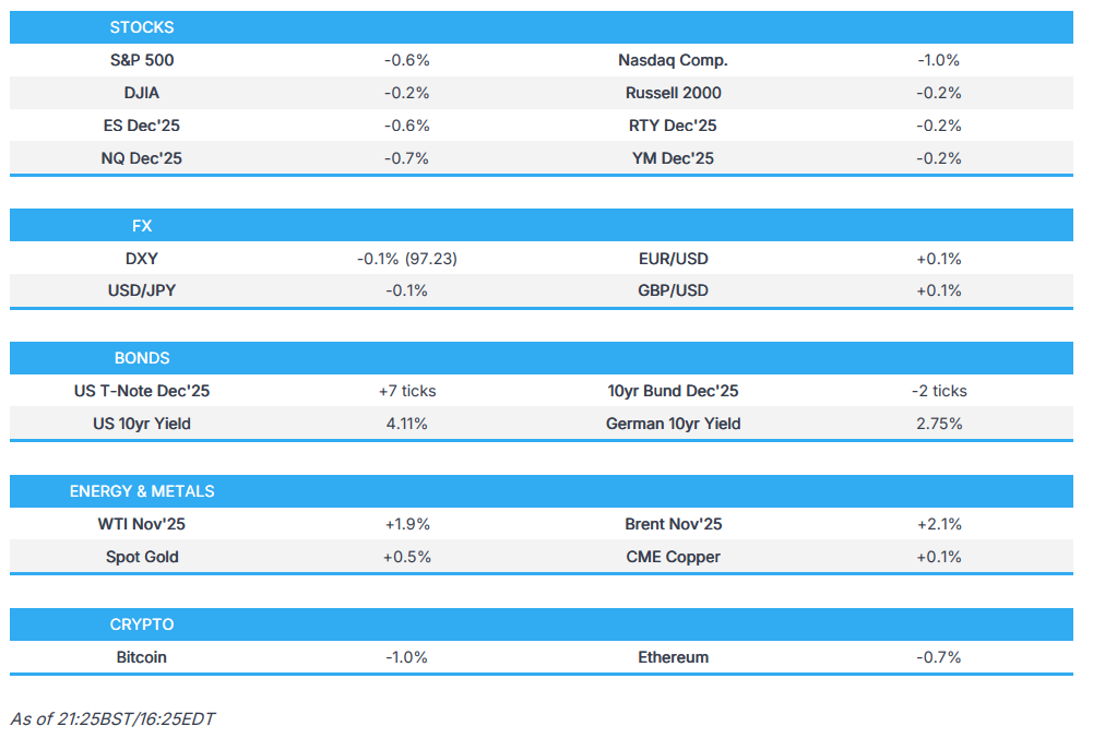 - US stocks closed lower, putting the recent rally on standby for now. The sector breakdown saw Energy outperform amid a rebound in crude prices; meanwhile, Consumer Discretionary and Technology lagged. NVIDIA (NVDA, -2.8%) pared some of Monday's upside on the OpenAI deal, which was the biggest weight contributing to SPX's 0.6% and NDX's 0.7% decline, followed by Amazon (AMZN, -3%).
