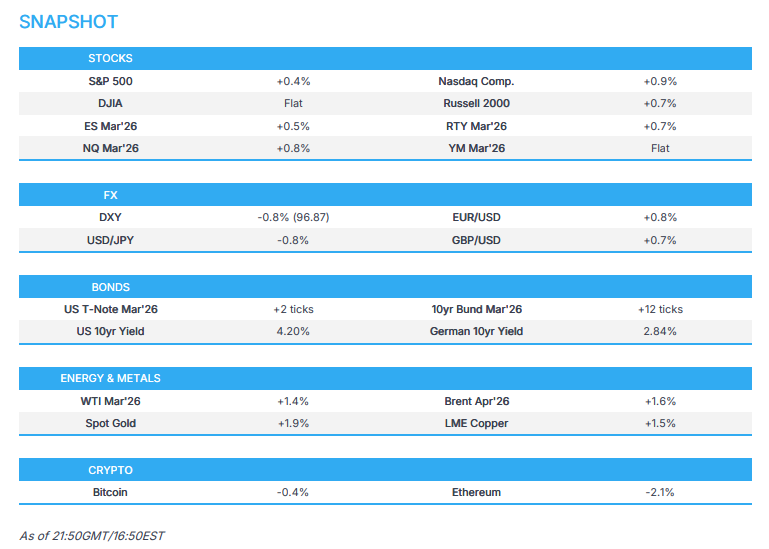 - SPX +0.42% at 6,961, NDX +0.77% at 25,268, DJI +0.04% at 50,136, RUT +0.68% at 2,689.