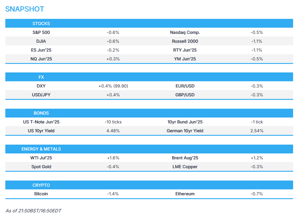 - USD extended on recent gains in which the DXY climbed to just shy of the 100.00 level despite there being very little in the way of fresh macro catalysts from the US and with a lack of fireworks from the FOMC Minutes which reinforced the wait-and-see message and noted that staff cited tariff policies as implying a larger drag on activity than policies they had assumed in their prior forecast. Nonetheless, there were several trade-related headlines including the Trump administration ordering US chip designers to stop selling to China, while US and EU trade officials are to conduct talks.