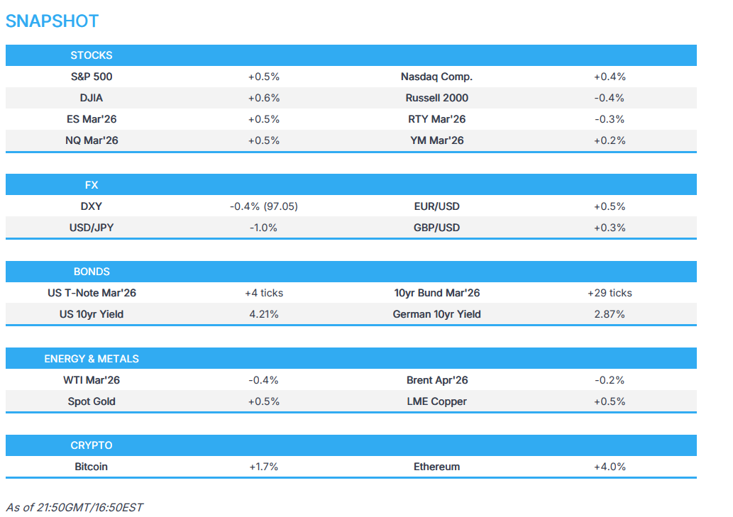 - SPX +0.5 at 6,950, NDX +0.4% at 25,713, DJIA +0.6% at 49,412, RUT -0.4% at 2,659.