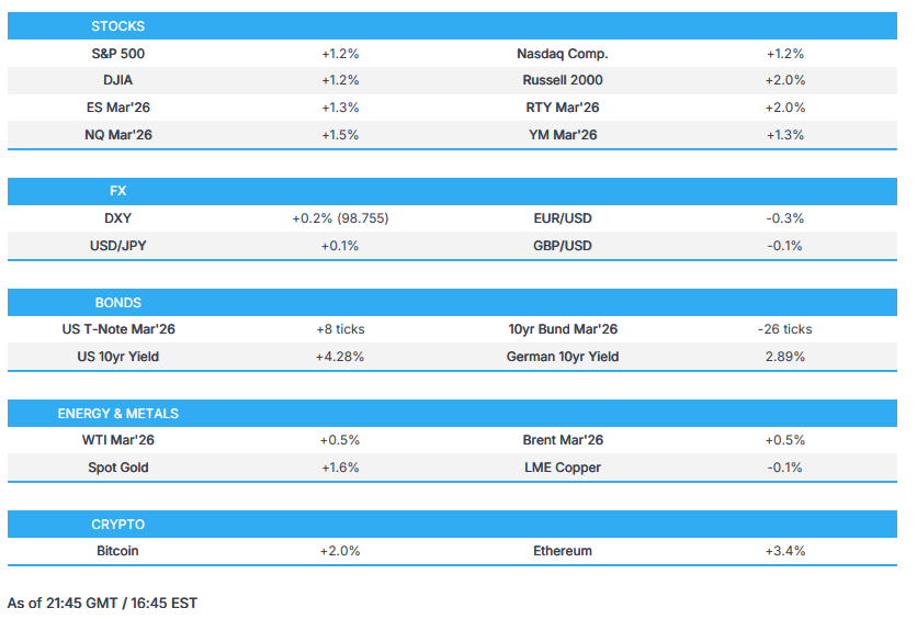 - SPX +1.16% at 6,876, NDX +1.36% at 25,327, DJI +1.21% at 49,077, RUT +2.00% at 2,698.