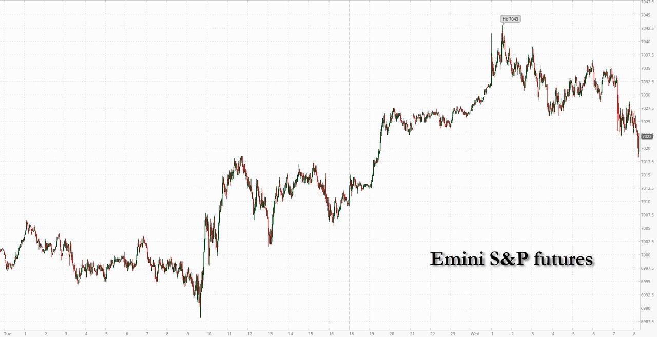 US equity futures are rallying into record territory, led by Tech as overnight earnings (ASML, SK Hynix, STX, TXN) boost the group and help fuel the AI trade, perhaps pausing the broadening theme. As of 8:00am ET S&P futures are up 0.2% pointing to a sixth-straight advance that would mark the longest winning run in almost seven months and will push the S&P 500 cash index above the 7,000 mark for the first time when US markets open; Nasdaq futures surge 0.8, putting the index within touching distance of its October record, with Mag 7s and Semis bid in premarket trading, led by AMD (+2.3%), AVGO (+1.4%), and NVDA (+1.6%). Cyclicals are leading Defensives as Fins/Indu/Mats outperform and Staples lag. Bond yields are flat while the dollar advanced 0.2%, snapping a four-day slide that left the currency at its lowest level in nearly four years. Commodities are mixed: gold +1.7% and silver +0.4% to new record highs, as the Energy complex is under pressure (natgas -8%) with Ags maintaining a bid. Today’s macro focus is on the Fed unchanged announcement (full preview here) with the market looking to see if the Fed identifies growth or inflation as the biggest risk but with no moves expected and three Mag7 earnings releases (full preview here).