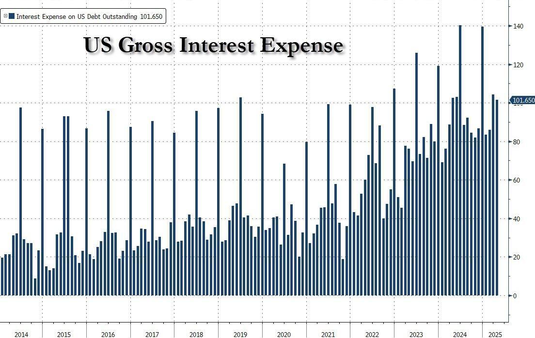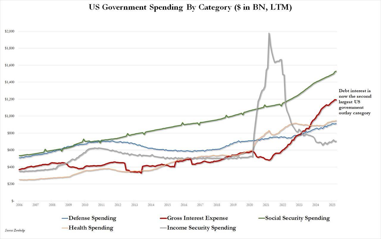 And while all of that is a good start, and certainly a big improvement in the US fiscal picture in the first three months of Trump's regime, the big picture sadly remains a dismal one, largely because the US debt picture remains completely unsustainable and manifests itself in $1.2 trillion in gross interest expense per year, just $300 billion shy of the biggest spending category of them all: Social Security Spending.