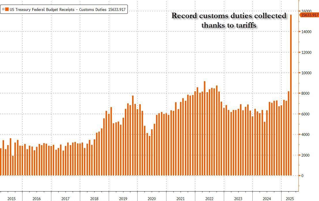 And while the primary reason for the unexpected budget surplus was a far bigger tax haul than expected, mostly thanks to a burst in capital gains tax which is unlikely to be repeated this year (unless we see the S&P rise another 20% from here by year end), there was another big reason for the April revenue surge, a reason we profiled previously in "Trump Trade War Results In Record $12 Billion Surge In Customs Revenues." As shown in the chart below, Customs Duties in April doubled from $8.2 billion in March to a record $15.6 billion in April, thanks to surge in Trump tariffs.