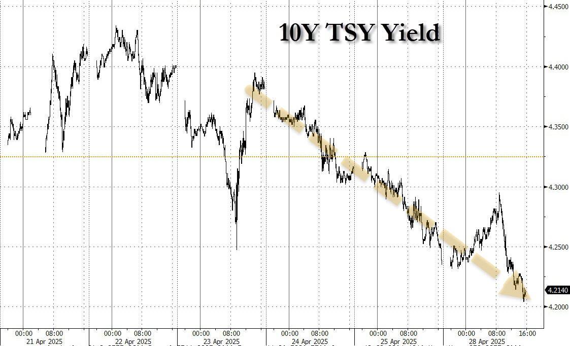 This unexpected drop in pro forma debt issuance (because one way or another, the debt ceiling constraint will go away), may be the reason why yields have been sliding all day, and at 4.21% are at session lows.