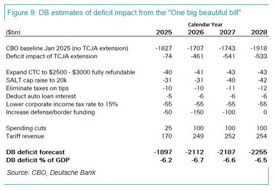 And while fiscal flows could deteriorate in the coming quarters - especially if there is a sharp recession - that risk is largely viewed as relatively low, for now. Meanwhile, DB economists estimate the deficit impact from TCJA extension and other Trump proposals could be largely offset by higher tariff revenues this year, before the deficit widens out more substantially relative to the CBO baseline next year and onward.