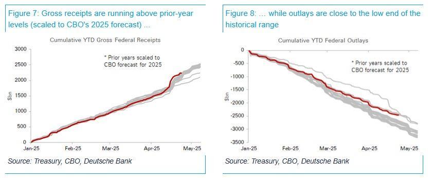 To be sure, this also should not be a huge surprise, because as we also reported just before the Treasury press release, "fiscal flows year-to-date are coming in better than expected (thank you DOGE). Gross receipts are tracking slightly above prior-year levels (adjusted for CBO forecasts for 2025), while outlays are closer to the bottom of the historical range, although sadly nowhere near enough to make a notable impression over the long-term."
