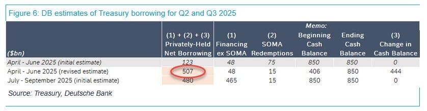 What we didn't say, because we didn't know it (and neither did anyone else), is what the Treasury reported as an endnote to its borrowing needs paragraph, namely that "the current quarter borrowing estimate is $53 billion lower than announced in February" which indicates that DOGE is indeed working and the US funding needs are actually declining.