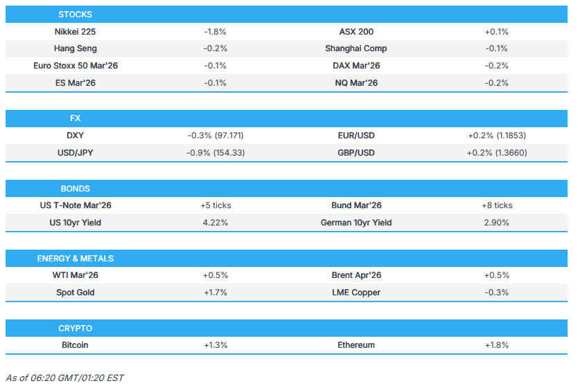 - USD/JPY slumped to beneath the 154.00 handle with the Japanese currency bolstered by double intervention risk after Japanese PM Takaichi warned that the government is ready to take action against speculative moves amid a weakening currency and surge in bond yields, while it was reported on Friday that the New York Fed had conducted rate checks on USD/JPY.
