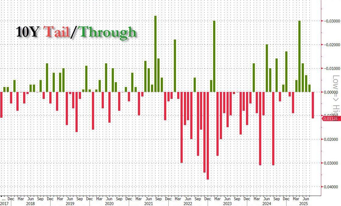 Starting at the top, the auction stopped at a high yield of 4.255%, down from 4.362% in July, and the lowest since December. So far so good, however, the yield also tailed the 4.2440% When Issued by 1.1bps, the first tail since February, and follows 6 stop throughs.