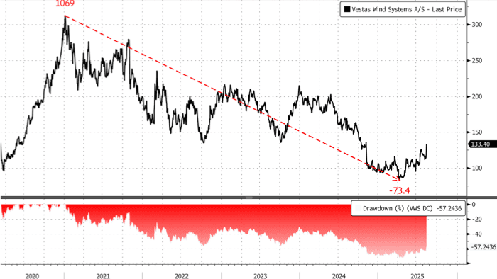 In markets, Vestas shares in Copenhagen jumped sharply, up 15.7% - the largest daily increase since July 28, 2022, when shares rose 15.8%. High interest rates, inflation, and the broader downturn in the green energy industry in the Trump era have battered the stock.