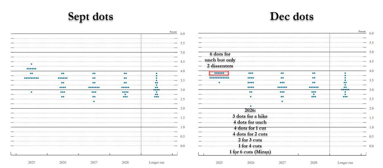 Consensus was expecting a hawkish rate cut, and while it got the cut, the hawkish elements - more dissenters, higher dots, a pushback by Powell during the presser - did not not materalize, and instead we have a low-grade revolt by the non-voters at the Fed (6 dots for unch today, only 2 dissents, more 3 dots expecting a rate hike in 2026), yet that will be promptly snuffed by whoever Trump picks to replace Powell next May.