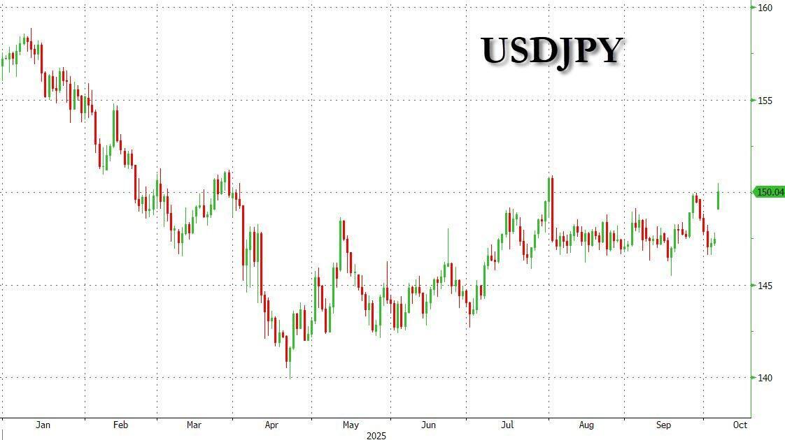 As BBG FX strategist Vassilis Karamanis writes, pro-stimulus lawmaker Sanae Takaichi’s near-certain elevation as Japan’s next prime minister took traders by surprise, and options show a rush to own downside exposure in the yen, despite its already steep decline which sent it to the lowest level since early August and, prior to that, since February.