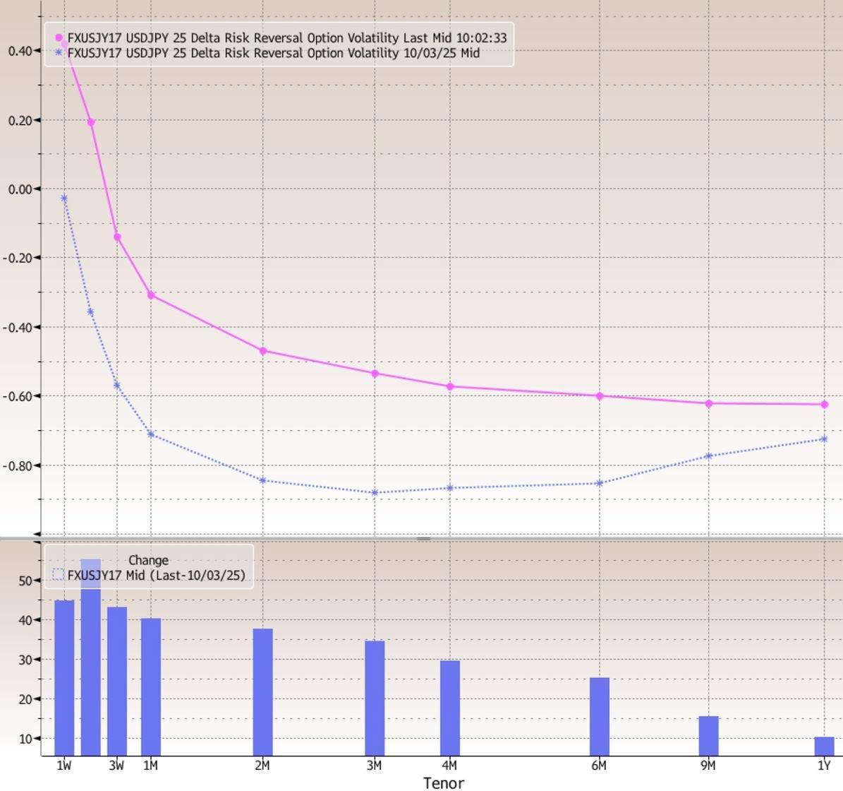 As Karamanis notes, it’s a common picture across the pair’s vol skew which shifts higher across tenors this morning. The largest move is seen on the two-week tenor where risk reversals are heading for their strongest close in favor of the greenback since Sept. 2022