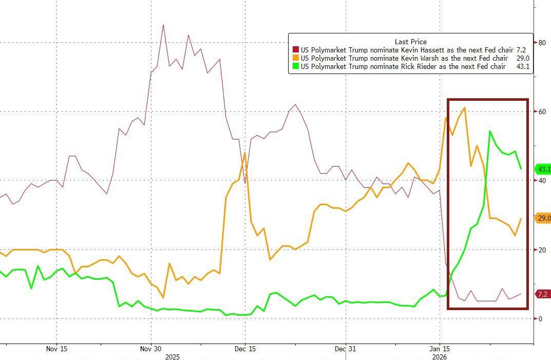 Additionally, will Powell make any mention of his plans to remain on The Fed? Or who his replacement will be (with Rick Rieder currently the unexpected front-runner across prediction markets)...