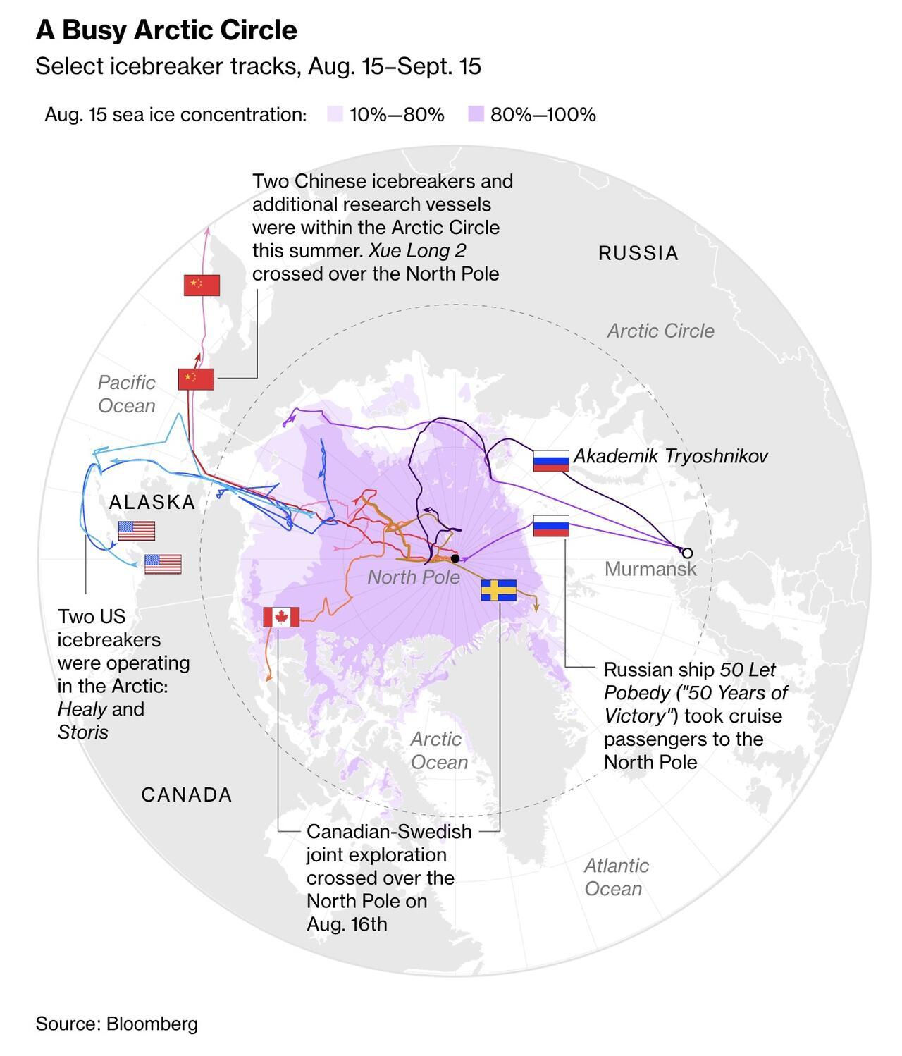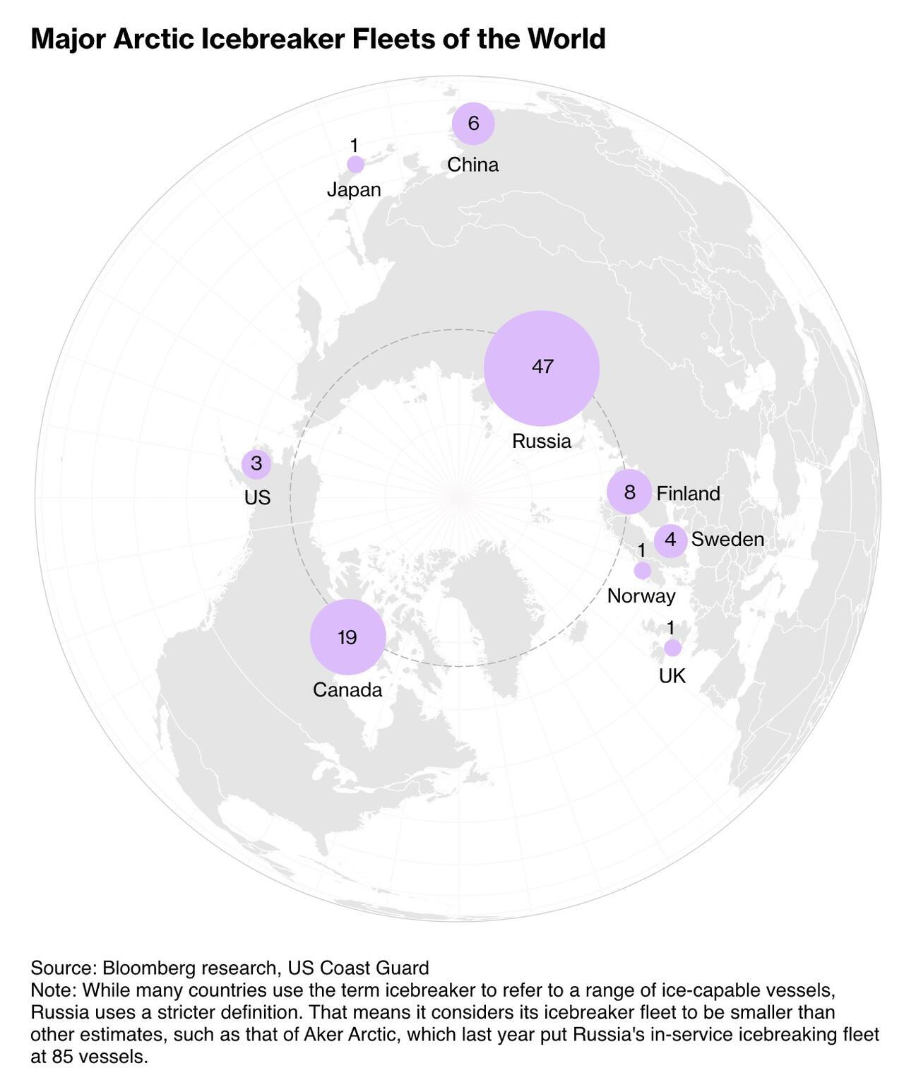 Bloomberg writes that globally, the competition is fierce. Russia leads with 47 heavy or medium icebreakers in service and at least 15 more in the pipeline. “Nobody has such a powerful fleet as us,” Vladimir Putin boasted in August, noting that eight of Russia’s ships are nuclear-powered. China, Finland, and others are also expanding. “I have never seen a demand signal like this in shipbuilding for icebreakers,” said James Davies, CEO of Quebec-based Chantier Davie.