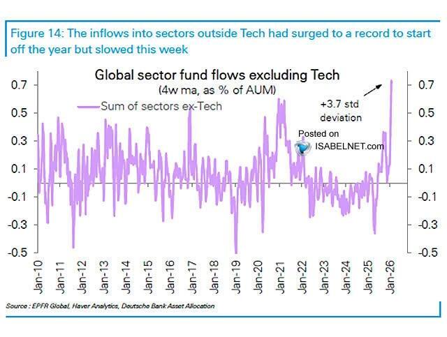 A weak dollar trend also encourages leverage through unhedged international stock exposure. As shown, investors have piled into global sector funds (excluding technology) over the past year to boost returns. However, the last time we saw that kind of exposure shift was in 2021, just before the counter-trend rally in the dollar that hit returns fast.