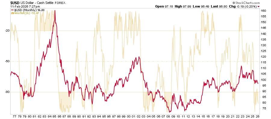 First, positioning and technicals matter. From a long-term technical perspective, the U.S. Dollar Index is attempting to stabilize after a 2025 downside move. As shown, using a 3-year price momentum measure, the dollar is as oversold now as it was at previous dollar bottoms. The current move lower is becoming increasingly stretched, reducing the catalyst needed to trigger a sharp reversal.