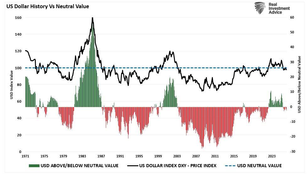 Despite the recent pullback in the dollar, it is trading at its “Neutral Value” and is at the same level it was in 1970. Such certainly does not support the “debasement” or “demise of the US Dollar” narratives.