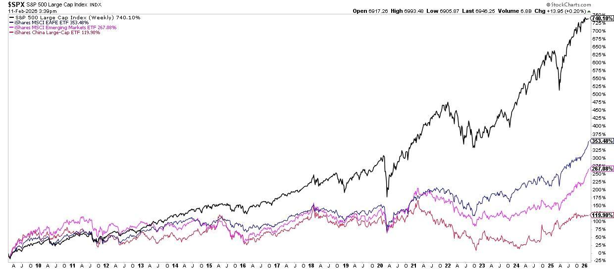 MSCI data shows the MSCI EAFE Index (ex-US) forward P/E at 15.3 as of January 30, 2026. The level looks reasonable in isolation; however, the key issue is what investors receive for that multiple. Given that earnings growth rates, margins, and sector mix are vastly weaker than in the U.S., overvaluation will matter in those countries, just as it does in the U.S.