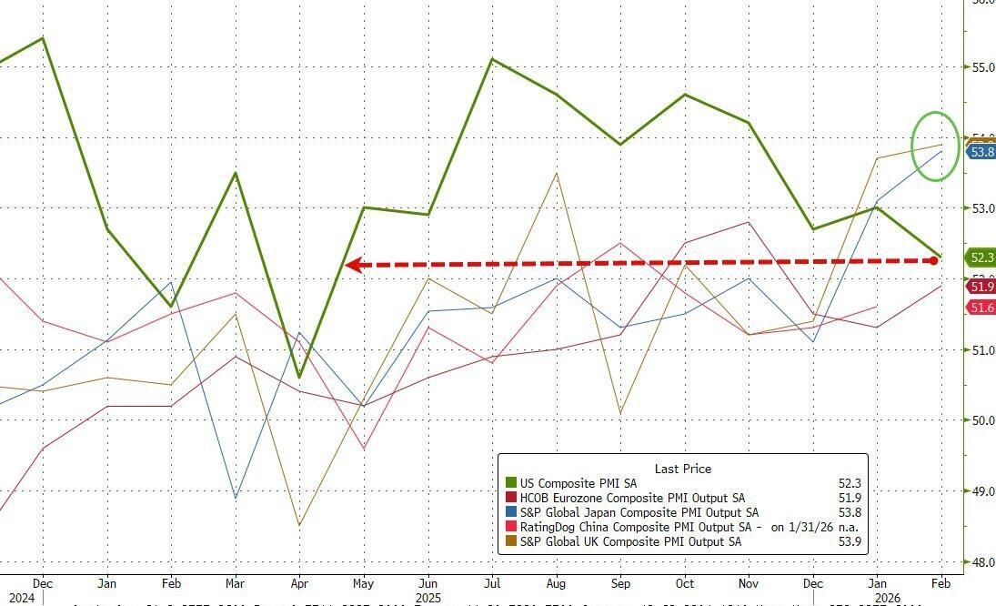 Overall that dragged the US Composite PMI down to its lowest since April 2025 (and weaker than UK and Japan)...