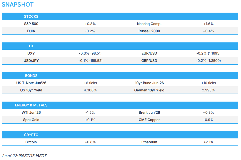- US stocks ended Friday firmer as sentiment improved on hopes of progress in US-Iran negotiations, driving a risk-on tone across assets. Tech outperformed after strong INTC earnings lifted the chip sector. Gains in Qualcomm (QCOM) also helped the tech sector after the Co.'s ARM data centre CPU is scheduled to launch in June.