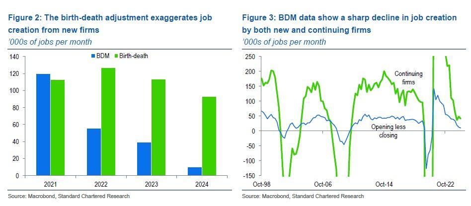 - This strongly implies that correctly measured net job creation from new firm openings is well below the BLS birth-death estimate of around 90k monthly.