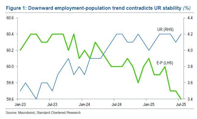Luckily, we have answer: in a note from Standard Chartered's head of global FX and titled just, Steve Englander calculates that investors would want to see NFP below 40k and the UR at 4.4% or more for a 50bps cut to be on the table.