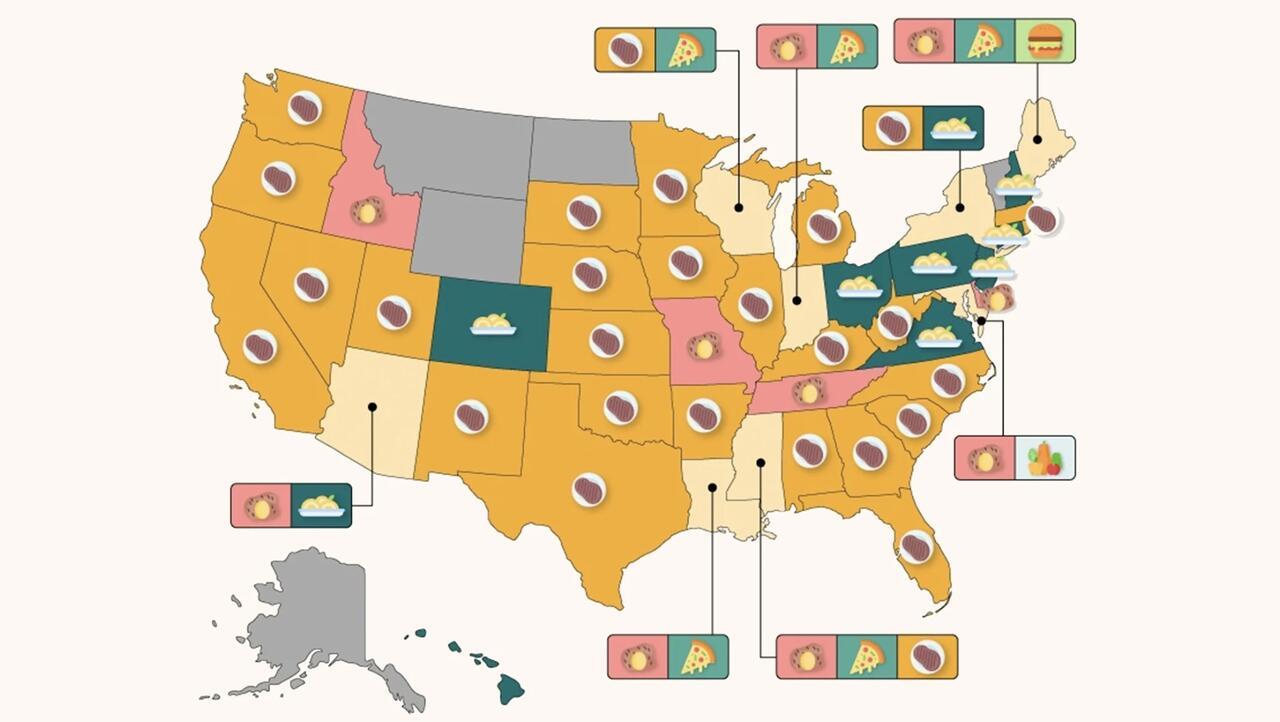 State-level data showed steak on top in 25 states, including Texas, California, and Florida, and tied in two others. Pasta took the number one spot in eight states and tied for first in two more, while potatoes claimed first place in four. For beverages, soda dominated across the board, with wine second in 17 states and tying in eight others.
